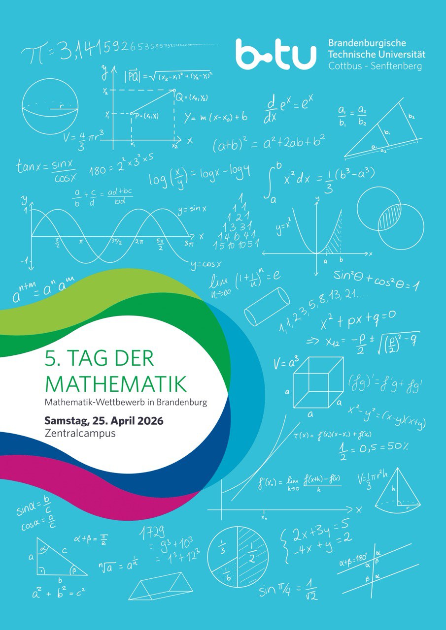 es freut uns sehr, Sie zum 5. Tag der Mathematik an die BTU Cottbus-Senftenberg einladen zu dürfen. Im Zentrum des Tages steht der große Mathematik-Wettbewerb für Teams in drei Altersstufen.