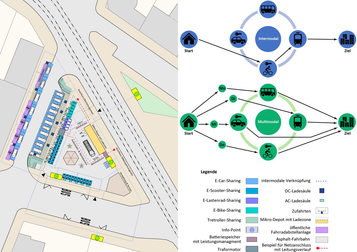Neben baulichen und verkehrsrechtlichen Maßnahmen, die einen direkten Eingriff in die Verkehrsinfrastruktur des MIV vornehmen, ist die Bereitstellung alternativer Mobilitätsangebote ein wichtiger Schlüsselfaktor, um neben der Pkw-Reduktion die Mobilität im Quartier sicherzustellen. In der vorliegenden Arbeit werden dafür im dritten Teil des Maßnahmenkatalogs mit einer Potenzialkarte Möglichkeiten aufgezeigt, durch die das Mobilitätsangebot im Kiez erweitert werden kann. Als Vertiefung zeigt die Abbildung 6 den Entwurf einer Mobilitätsstation mit der Bereitstellung eines hohen Angebots an Sharing-Diensten. Die Pkw-Reduktion beruht dabei auf der Förderung eines inter- und multimodalen Verkehrsverhaltens sowie der kollaborativen Nutzung verschiedener Verkehrsmittel. Darüber hinaus wird zur Sicherung eines Grundmaßes an umwelt- und stadtverträglichem MIV das Themenfeld der Elektromobilität vertieft. Im Rahmen der Planung der abgebildeten Mobilitätsstation werden die Anforderungen und Möglichkeiten der Ladeinfrastruktur sowie deren Anschluss und Integration im öffentlichen Raum dargestellt. Die Abbildung 7 veranschaulicht für den Anschluss der Ladeinfrastruktur an das Versorgungsnetz zwei verschiedene Verfahren. Neben dem herkömmlichen Verfahren wird auch ein Zukunftsszenario abgebildet, bei dem die Ladeinfrastruktur der straßengebundenen Elektromobilität durch den Gleichstrom aus der Tram- Oberleitung betrieben wird.