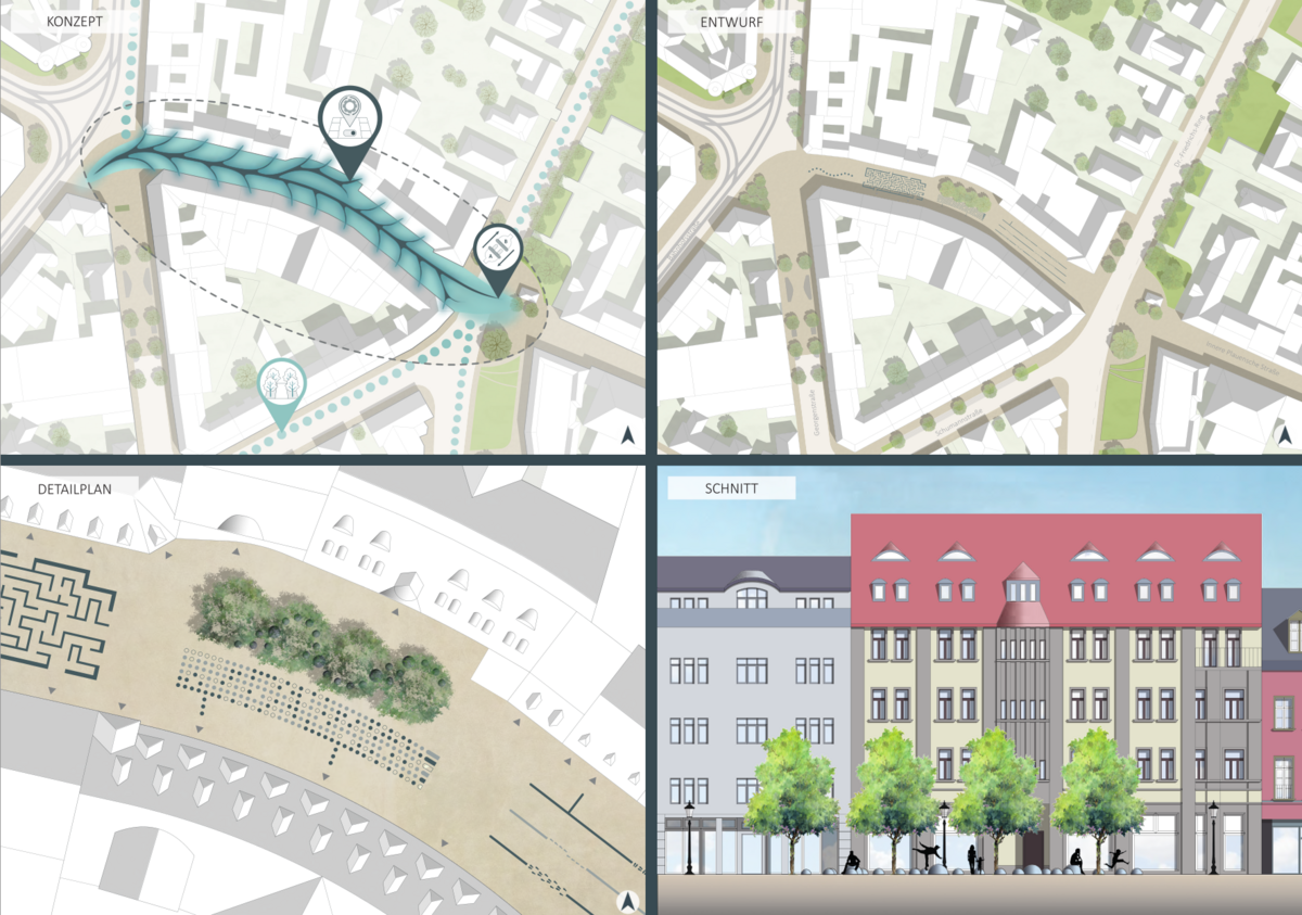 Hierfür werden zunächst die raumgebenden Kanten des ehemaligen Gebäudes formal aufgegriffen, um ein authentisches Raumgefühl zu erzeugen. Die Ecke am Kreuzungsbereich ist maßgebendes Element. Wesentlicher Aspekt des konzeptionellen Ansatzes ist die Erhaltung der Streetart-Zeichnungen, die dem Ort Charakter geben und als Kulisse dienen.