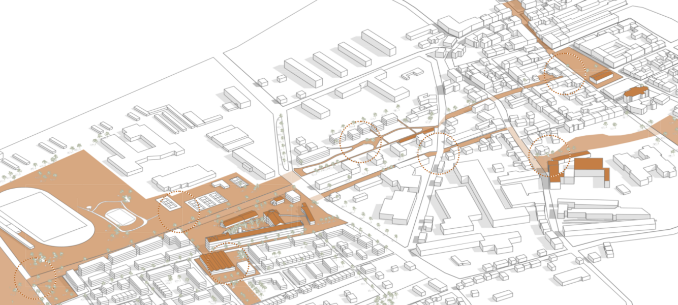 Das Leitbild verdeutlicht eine räumliche Zielvorstellung für ein Teilstück der südlichen Stadt Finsterwalde. Hierbei geht es vor allem darum, bestehende Industriegeschichte räumlich zu verorten und miteinander zu verknüpfen. Des Weiteren wird eine Grünraumverbindung angestrebt, um ein übergeordnetes Grünraumnetz zwischen Osten und Westen zu schaffen. Kernstück des Leitbildes stellt die Stärkung der Ost-West-Verbindung zwischen der Innenstadt und der Bürgerheide dar, dessen Schnittstelle die ehemalige Tuchfabrik Koswig darstellt. Die räumliche Qualität wird durch eine Abwechslung zwischen breiten und schmaleren Zonen geschaffen, die sich an die städtebaulichen Gegebenheiten anpassen.
