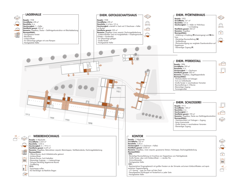 Charakteristisch für das Gelände ist neben dem eigenen Industriegleis ein alter Baumbestand und die für die Architektur verwendete Ziegelbauweise. Das Gleis führte ursprünglich in seiner gesamten Länge durch das Gelände. Beginnend im Osten mit der Werksdurchfahrt der Schlosserei, verlief sie zwischen dem Kontor und dem gegenüberliegendem Gesellschaftshaus zum Tautbau des Webereihochhauses.