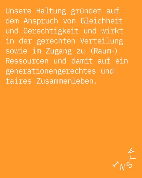 Unser Tun steht im Spannungsfeld zwischen sozialen, ökologischen und ökonomischen Anforderungen. Wir sind uns der Tragweite und Langfristigkeit von Entscheidungen bewusst – sie betreffen das Gemeinwohl, die Umwelt und künftige Generationen. Unsere Haltung gründet auf dem Anspruch von Freiheit, Gleichheit und Gerechtigkeit. Wir wirken darauf hin, dass der Zugang zu (Raum-)Ressourcen für alle gerechter verteilt ist. Das bedeutet, dass wir unter- und ungenutzte städtische Räume aktivieren und gemeinsam mit den Nutzenden gestalten wollen. Wir streben ein generationengerechteres und faires Zusammenleben an.