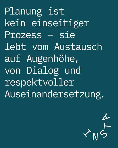 Wir fördern eine offene Planungs- und Diskussionskultur – auch bei uns in der Lehre machen wir unterschiedliche Perspektiven sichtbar und verhandeln darüber miteinander. Planung ist kein einseitiger Prozess – sie lebt vom Austausch auf Augenhöhe, von Dialog und respektvoller Auseinandersetzung. Unsere Haltung vermittelt Werte: Offenheit, Respekt, Mitgestaltung und Verantwortung. Wir streben nach Vielfalt und gleicher Teilhabe aller.