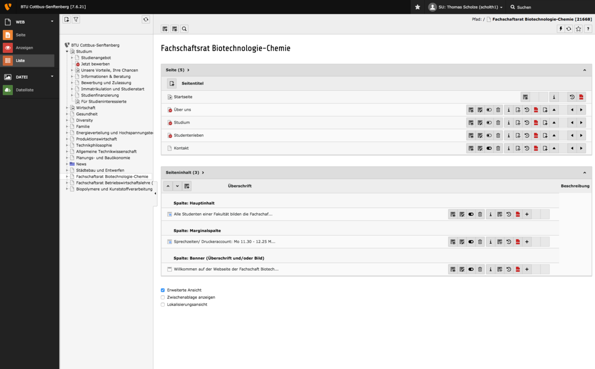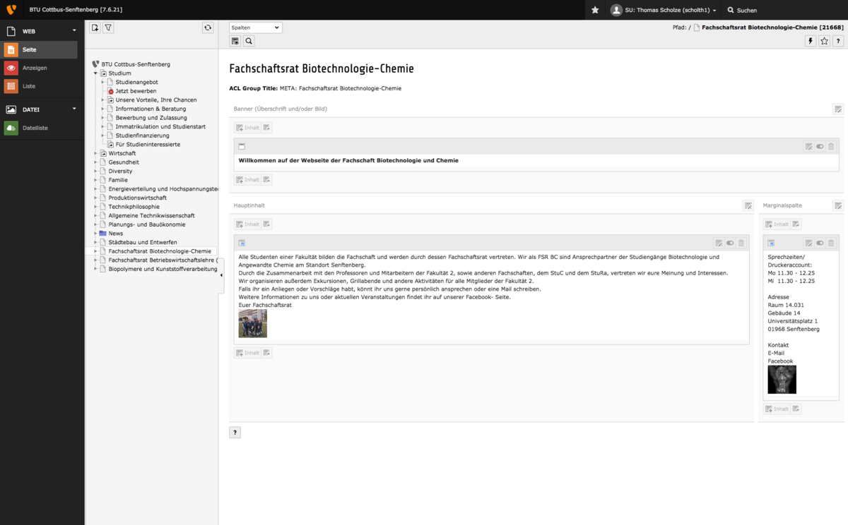 Am Dienstag, dem 29.08.2017, wurde das Content Management System (TYPO3) der BTU auf eine neue Hauptversion aktualisiert. Die gravierendste Änderung für Redakteure ist dabei die komplett neu gestaltete Oberfläche zum Bearbeiten der Inhalte (Backend). An der grundlegenden Funktionalität hat sich nicht sehr viel geändert, lediglich die Darstellung wurde aktualisiert.