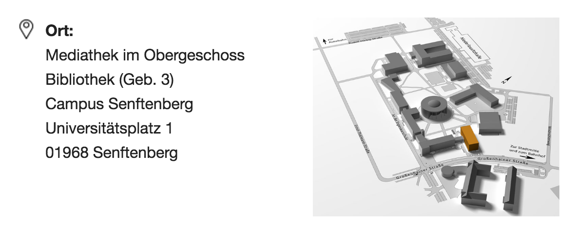 - Ist der Veranstaltungsort ein Ort der BTU, so wird in der Artikelansicht eine Karte mit dem Gebäude neben den Ortsinformationen eingeblendet. Durch einen Klick auf das Bild kann die Ansicht der Campuskarte vergrößert werden.