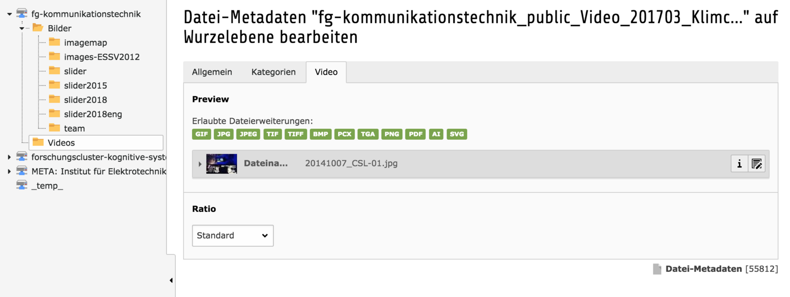 Für Video-Elemente (.btufilevideo) kann in der Dateiliste ein Vorschaubild hinzugefügt und das Format festgelegt werden. Ist kein Vorschaubild hinterlegt, wird vom Video das erste Bild angezeigt. Häufig ist dieses Bild komplett schwarz/weiß oder zeigt eine Person in unvorteilhafter Position. Mit dem Hinzufügen eines Vorschaubildes kann dies verhindert werden. Die Auswahl des Formats lässt die Unterscheidung zw. 4:3 (Standard) und 16:9 zu.