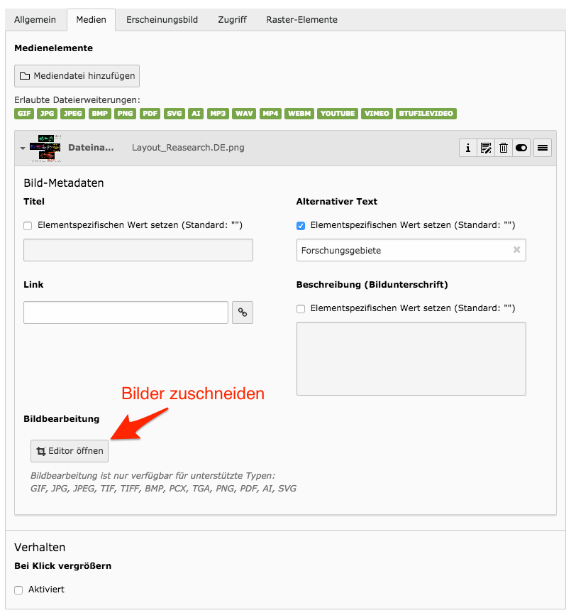 Für jedes verknüpfte Bild ist es möglich das Bild im TYPO3 zu zuschneiden, siehe Screenshot. Das hat den Vorteil, dass ein und das selbe Bild nur einmal im System hinterlegt werden muss und trotzdem für verschiedene Ausgabeformate verwendet werden kann.