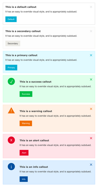 - Gestaltete Hinweis-Elemente für Informationen, Warnungen, Fehler oder erfolgreiche Aktionen; Diese Elemente werden sukzessiv in die Oberfläche integriert