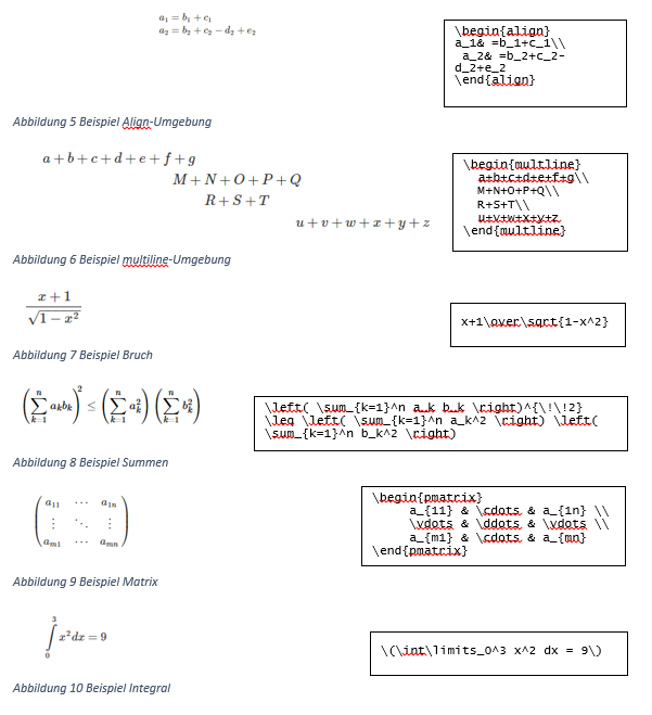 Grundsätzlich können alle Kommandos verwendet werden, die auch innerhalb der Mathe-Umgebung in LaTeX existieren. Im Folgenden ein paar Beispiele: