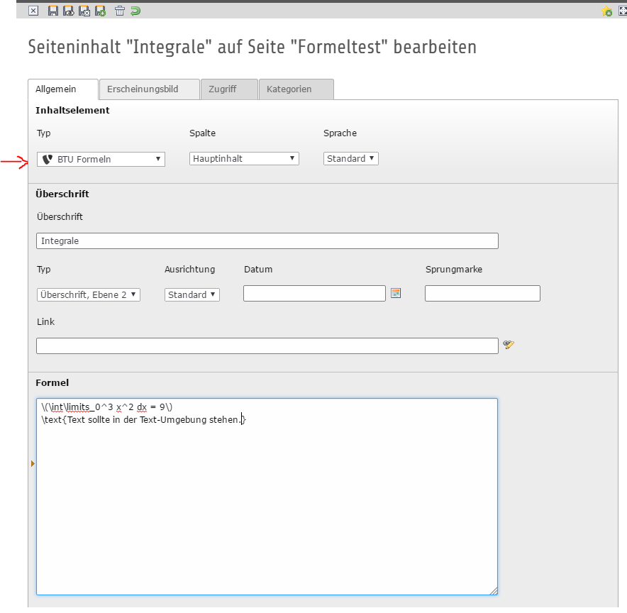 Die TYPO3-Erweiterung „btu_formula“ stellt mit Hilfe von MathJax Formeln auf der Webseite dar, die im Backend in TeX-Notation eingepflegt wurden.