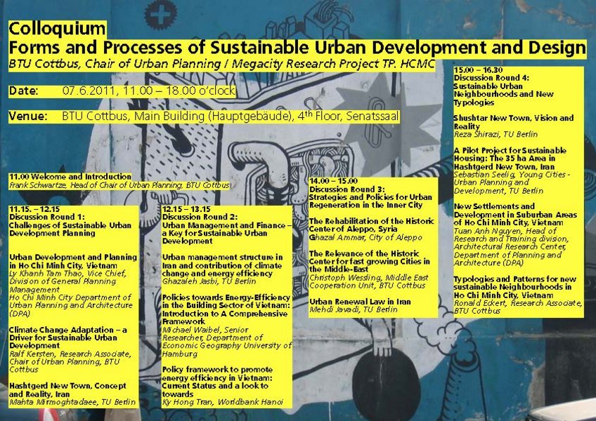 The colloquium on "Forms and Processes of Sustainable Urban Development and Design" was chaired by the Urban Planning Department in the context of the Megacity Research Project TP. Ho Chi Minh City (HCMC) on Tuesday the 7th of June 2011 at Brandenburg University of Technology (BTU) in Cottbus, Germany. Visiting scientists, practitioners, doctoral candidates and colleagues from the BTU Cottbus as well as from partner universities participated in an open discussion. The colloquium included international perspectives and projects which addressed the issue of how concepts of a sustainable and especially climate-oriented urban development and design can be developed and implemented. Special attention was drawn to the relation of concept and reality.