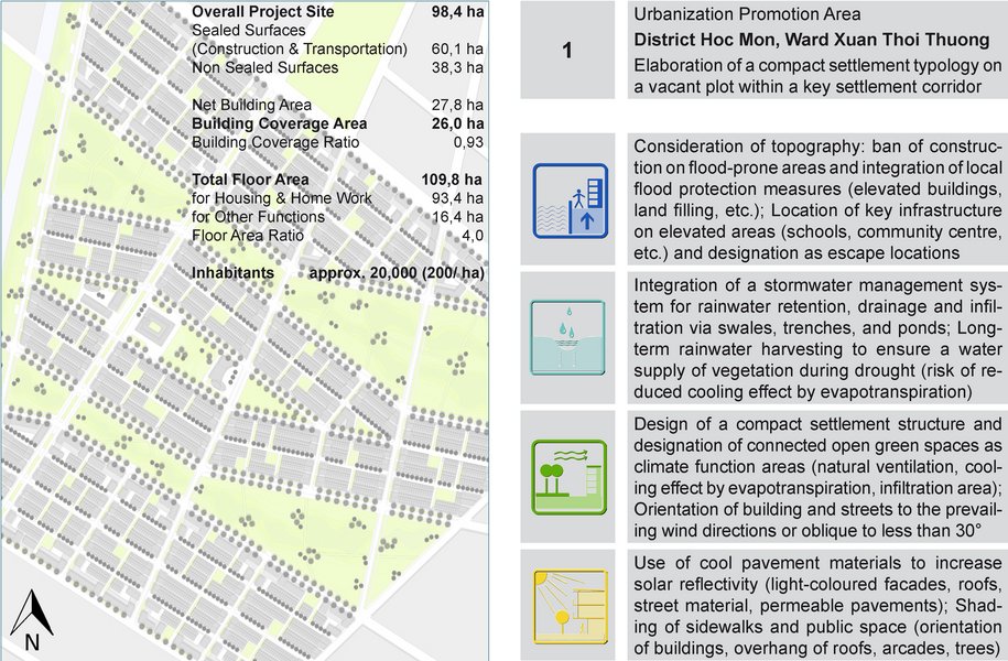 The planning study of District Nha Be shows that a further urbanization of HCMC’s wetlands – if not completely avoidable – has to be concentrated on existing elevated land or already raised transportation corridors to prevent a further excessive land claiming and large-scale land filling. Therefore, the proportion of feasible construction land is very low. In opposite to current development plans for these areas (e.g. HCMC’s planned Harbour City) the average population density has to be limited to approximately 30-35 inhabitants/ ha. This calls for a significant higher utilization of elevated areas in the north of HCMC. However, the planning study of District Hoc Mon evidences that the average population density can be increased only marginally (200-220 inhabitants/ ha) compared to current housing developments. Indeed, the elaborated settlement typologies allows for a higher utilization of built-up surfaces, but at the same time the proportion of unsealed open spaces as climate function areas is much higher. For urban sprawl areas like District 12, the planning study shows, that the protection of strategic open spaces is of top priority and the utilization of vacant sites for further construction is lower-ranked.