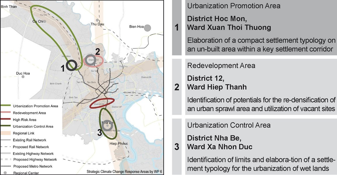 As “Application” component, the design of exemplary planning studies for climate change adapted and energy efficient neighbourhoods serves as a showcase to evaluate and demonstrate the potentials and limits of new settlements under the utilization of the presented urban design principles. Furthermore, the studies play a crucial role in demonstrating, simulating and testing the effective application of adaptation and mitigation strategies. Three study sites were identified according to WP 6’s “Strategic Climate Change Response Areas”. These sites represent different sets of challenges, which will become major fields of action for future urban planning in HCMC due to climate change.