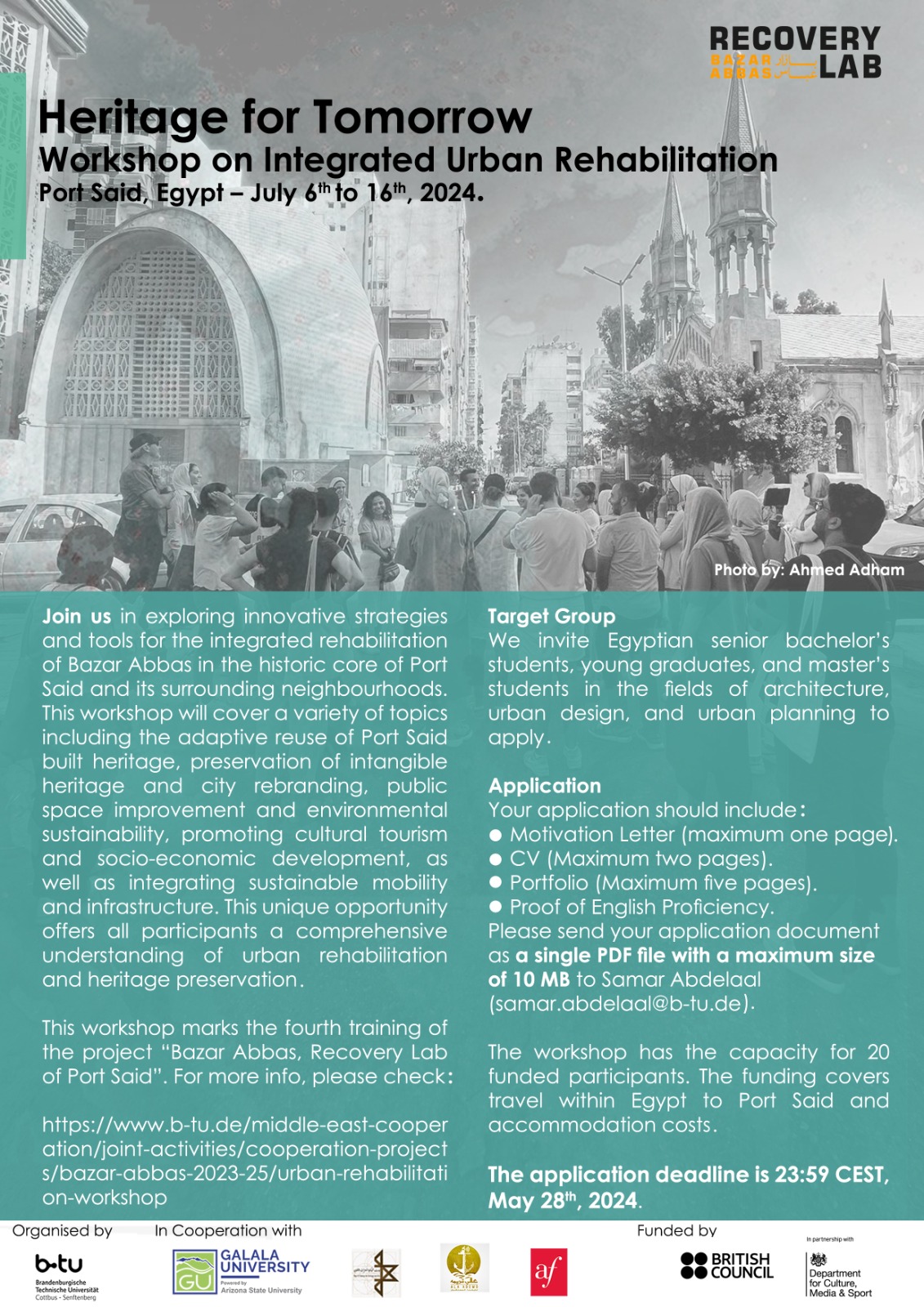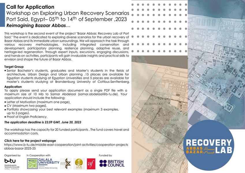 The MEC unit at the Chair of Landscape Architecture invites interested students and young graduates in Egypt as well as Master's students of BTU to apply for the urban recovery workshop that will take place in Cairo and Port Said from 5th to 14th of September 2023.