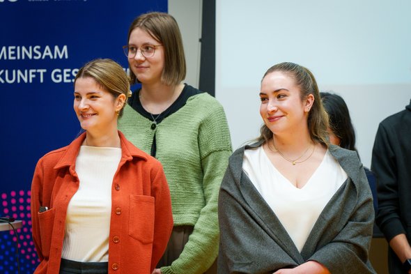 Darauffolgend verabschiedete der MINT-Botschafter der Fakultät 3, Pascal Fritzsche die ehemaligen Stipendiatinnen des Vorjahres. In seiner Rede erinnerte er noch einmal an die Höhepunkte, die wir gemeinsam mit ihnen erleben durften.