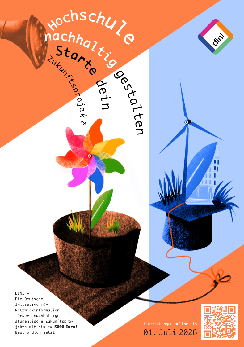 Deshalb möchten wir euch ermutigen, am bundesweiten Wettbewerb von DINI teilzunehmen. Gesucht werden nachhaltige Projektideen von Studierenden, die mit bis zu 5.000 Euro gefördert und anschließend umgesetzt werden können.