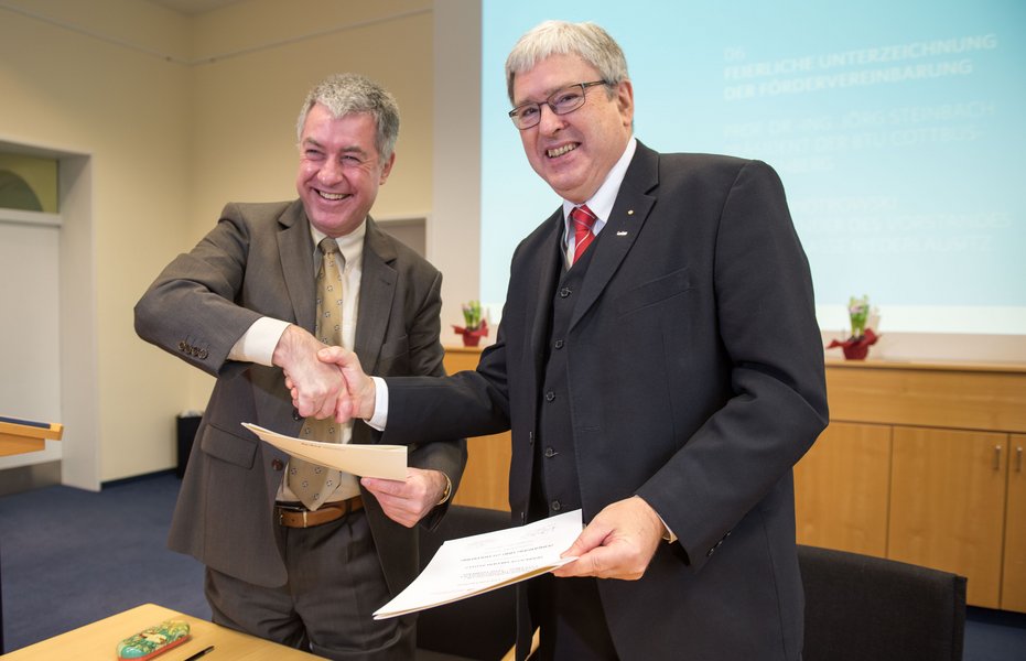 Der Vorsitzende des Vorstandes der Sparkasse, Lothar Piotrowski, und BTU-Präsident Prof. Dr.-Ing. Jörg Steinbach unterzeichneten die neue Vereinbarung am 23. Februar 2017 an der Universität in Senftenberg. Darin wird die Unterstützung von Kinderuni sowie Schüleruni/science academy am Standort Senftenberg festgeschrieben.