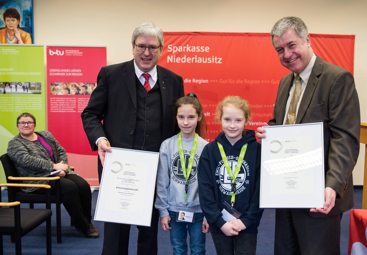 Zum Abschluss der von Jonas Neubert, dem Leiter der Zentralen Studienberatung, moderierten Veranstaltung wurde dem Präsidenten der BTU Cottbus-Senftenberg, Prof. Dr.-Ing. Jörg Steinbach, und dem Vorsitzenden des Vorstandes der Sparkasse Niederlausitz, Lothar Piotrowski, jeweils die Ehrenmitgliedschaft in der Kinderuni und Schüleruni verliehen. Marie und Anne Bellmann dankten im Namen des Organisationsteams und der Teilnehmenden für das besondere Engagement und die Unterstützung und überreichten die Urkunden über die Ehrenmitgliedschaft.