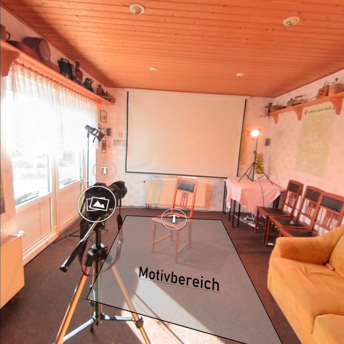 Mithilfe entsprechender Anwendungen haben wir im Team ein interaktives VR-Panorama erstellt, in dem der Aufbau einer 3-Punkt-Beleuchtung entdeckt werden kann. Die Lernenden versetzen sich dafür in einen virtuellen Raum, wo sie auf bestimmte Gegenstände klicken können, um damit mehr Informationen zum Thema zu erhalten. Dabei können sich Weiterbildungsinteressierte in verschiedene 360°-Aufnahmen hineinbegeben und dort auch kleinere Details näher untersuchen.