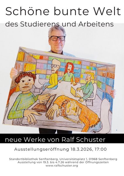 Die Ausstellung „Die schöne bunte Welt des Studierens und Arbeitens“ kann in der Mediathek der Universitätsbibliothek am Standort Senftenberg der BTU während der Öffnungszeiten bei freiem Eintritt besichtigt werden. Gezeigt wird sie voraussichtlich bis einschließlich zum Tag des offenen Senftenbergs am Sonnabend, 4. Juli 2026. Der Zugang erfolgt über den Haupteingang der Bibliothek von der Großenhainer Straße.