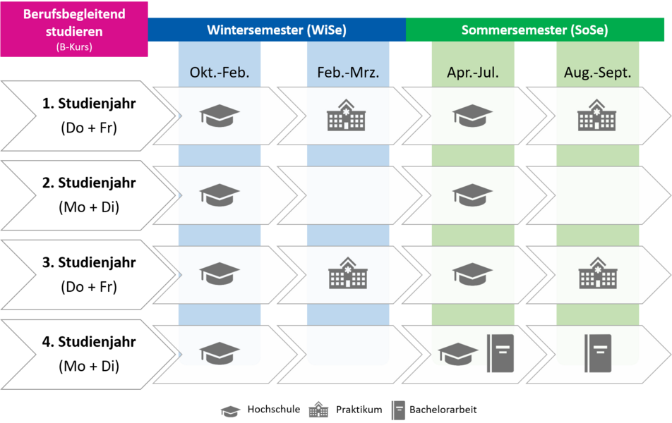 Die Präsenzzeiten des Bachelorstudiengangs sind so organisiert, dass Module an zwei langfristig festgelegten Tagen in der jeweiligen Semesterwoche stattfinden (Montag/Dienstag oder Donnerstag/Freitag).