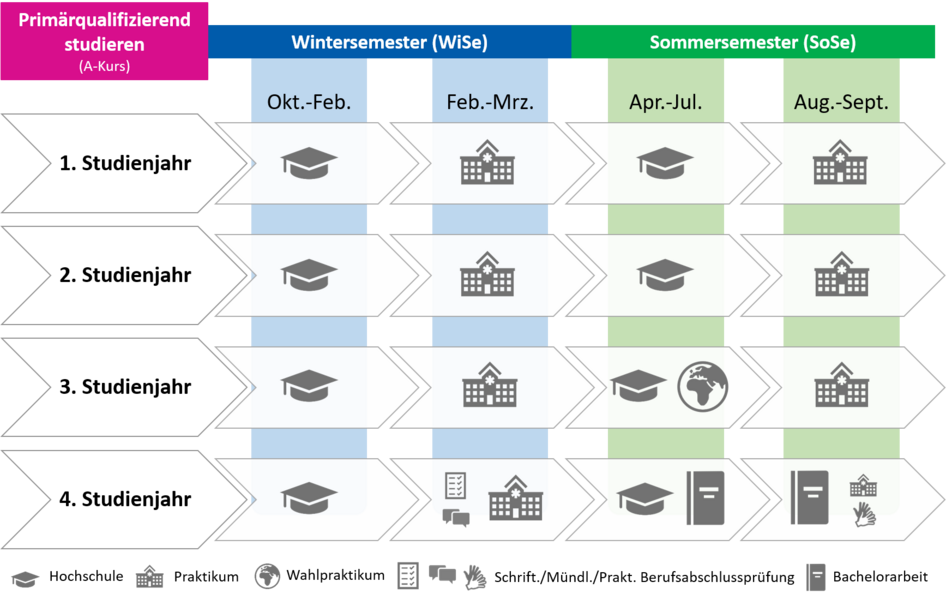 Das primärqualifizierende Studium stellt ein Vollzeitstudium dar und gliedert sich abwechselnd in Präsenzphasen an der Hochschule sowie in Praktikumsphasen in Einrichtungen des Gesundheitswesens. In den Präsenzphasen werden Sie sowohl theoretisch als auch praktisch auf die Praxisphasen vorbereitet. In diesen werden Sie aktiv in der pflegerischen Versorgung tätig sein und parallel von Pflegenden vor Ort als auch von Dozierenden der Hochschule begleitet. In der nachfolgenden Abbildung wird der vierjährige Studienverlauf im Überblick dargestellt.
