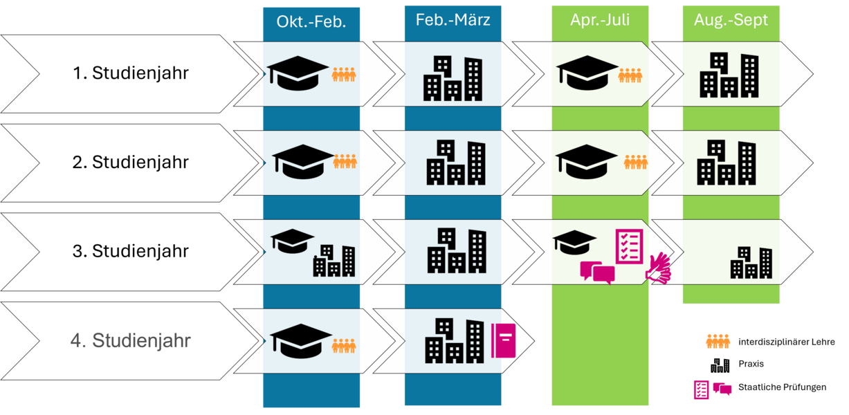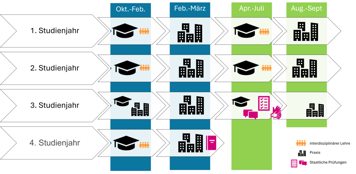 Das primärqualifizierende Studium stellt ein Vollzeitstudium dar und gliedert sich abwechselnd in Präsenzphasen an der Hochschule sowie in Praktikumsphasen in Einrichtungen des Gesundheitswesens. In den Präsenzphasen werden Studierende sowohl theoretisch als auch praktisch auf die Praxisphasen vorbereitet. In diesen werden Sie aktiv in der therapeutischen Versorgung tätig sein und parallel von Pysiotherapeut*innen vor Ort als auch von Dozierenden der Hochschule begleitet. In der nachfolgenden Abbildung wird der siebensemestrige Studienverlauf im Überblick dargestellt.