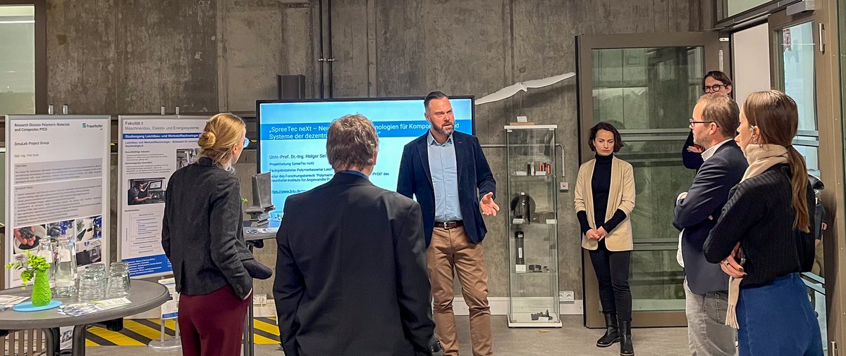 Ein zentraler Programmpunkt war die Vorstellung des Strukturstärkungsprojekts SpreeTec neXt inklusive eines Laborbesuchs. Prof. Holger Seidlitz und Tobias Röhrich gaben dabei Einblicke in die laufenden Forschungsarbeiten, die aufgebauten Infrastrukturen sowie in die enge Zusammenarbeit mit wissenschaftlichen und industriellen Partnern.