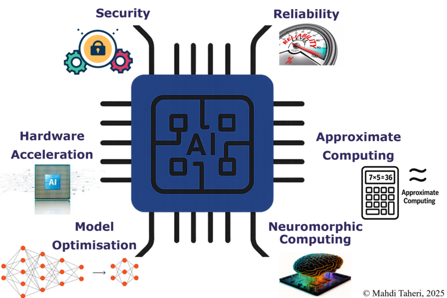 Der Schwerpunkt der Arbeiten liegt auf der Entwicklung und Optimierung fortgeschrittener KI-Modelle wie Transformern und LLMs sowie der Gestaltung energieeffizienter, zuverlässiger und sicherer Hardwarebeschleuniger. Forschungsrichtungen umfassen hardwarebewusste Optimierung, fehlertolerante Architekturen, Approximate-Computing-Methoden, neuromorphes Rechnen und Modellkompression für Edge-AI und sicherheitskritische Anwendungen.