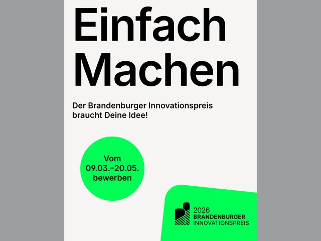 Der Brandenburger Innovationspreis – Erfolgreiche Wirtschaftspolitik braucht eine starke regionale Innovationskultur! Vom 09. März bis 20. Mai 2026 können Unternehmen und Verbundprojekte zwischen Wissenschaft und Wirtschaft ihre nachhaltigen Innovationen einreichen und bis zu 40.000 € Preisgeld gewinnen.