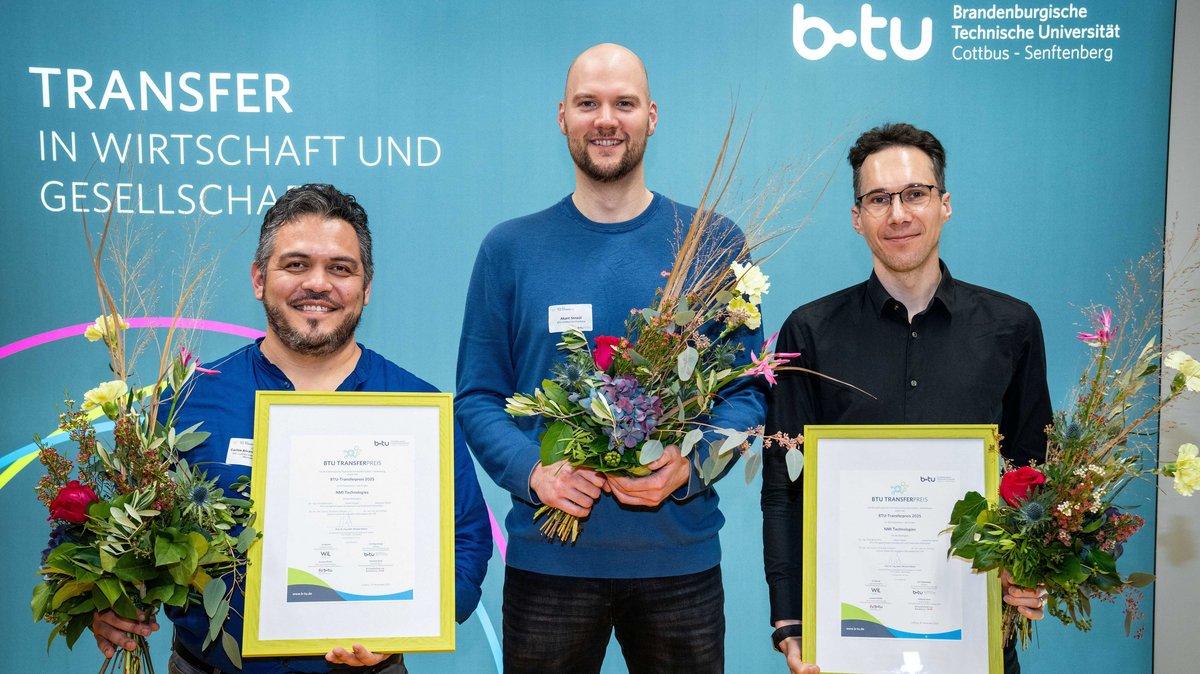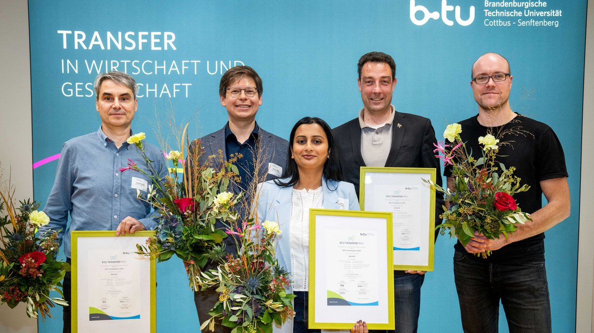 Höhepunkt des diesjährigen Transfertages an der BTU war die erstmalige Verleihung der mit insgesamt 14.000 Euro dotierten BTU-Transferpreise. Aus insgesamt fünf nominierten Kooperationen, die jeweils in einem Pitch ihr Projekt und die Transferleistungen vorstellten, wählte die Jury zwei herausragende Kooperationsprojekte aus. Die Gewinner hießen Mesh4U und NMI Technologies. Ein Sonderpreis ging an das Energie-Innovationszentrum (EIZ).