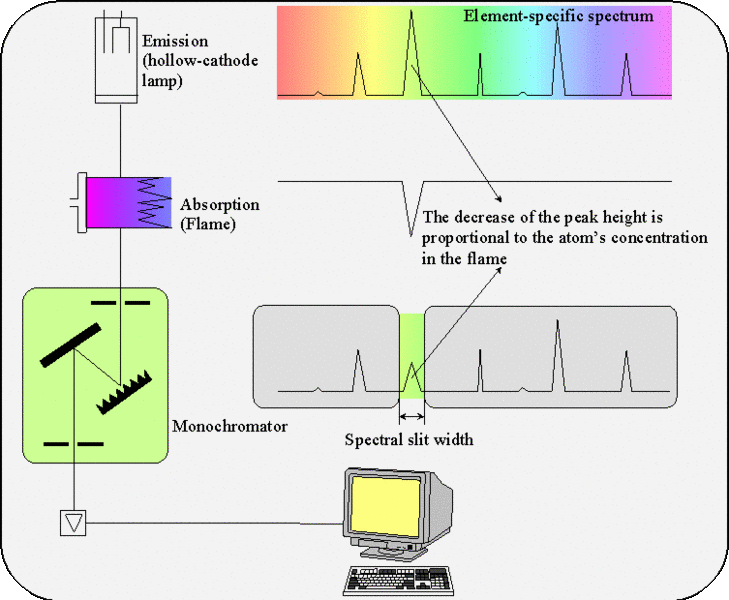 The atomic absorption spectrometry (AAS) is an analytical method based on the absorption of UV or visible light by gaseous atoms. The sample becomes atomized by injecting a solution into a flame (flame AAS) or by heating a dried sample in an energized graphite pipe (graphite tube AAS). As source of light, a hollow-cathode lamp (HCL) is used to determine the contained element. These element’s atoms in the flame absorb precisely the wavelength sent by the source of light. The absorption is proportional to the concentration. The light produced by the HCL is spectrally divided in the monochromator, and only the resonance line is passed trough the exit slit.