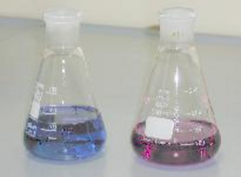 To find the end-point the analyst adds an indicator which forms a coloured but less stable complex with the metal ion. Additionally, a buffer solution is added to establish a suitable pH value. A suitable indicator is Eriochrome black T which is blue in a solution at pH 10. At the start of the titration it produces a wine-red complex. EDTA forms a more stable complex with the metal ions and so takes them away from the indicator. At the end point all the metal ions have been complexed with EDTA. The last drop of EDTA leaves no metal ions to form the red complex with the indicator so the indicator turns blue again.